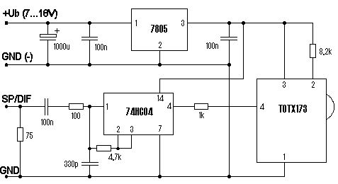 Ah, der gute alte digitale High-Speed Opamp 74HC04, immer wieder gern genommen ;) Alternativ (vermutlich etwas robuster, aber mit mehr Stromverbrauch) könnte man auch was mit "echten" Receivern, zB. SN75176A/B nehmen. Aber bei SPDIF wäre das eher Perlen vor die Säue.