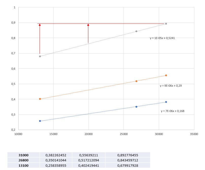 Ich habe dir hier mal beispielshalber eine 4. Gerade dazu fantasiert. Messwert wäre bei x=20000 y=0,6 Über die Funktion y_31000 = 0,329084662 + (31000 + 71880) * (y - 0,329084662) / (x + 71880) erhältst du auf dieser Geraden dann für x=31000 den y-Wert 0,711 (schwarze Linie)