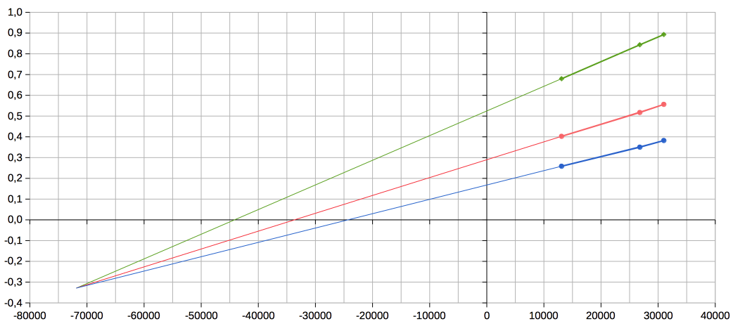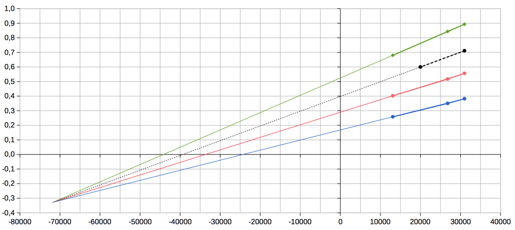 Korrektur: Und der Offset ak muss so gewählt werden, dass der Schnittpunkt bei x=31000 / y=0,9 liegt. Und der Offset ak muss so gewählt werden, dass der Schnittpunkt mit der x-Achse bei x=31000 / y=0,0 liegt. Es geht tatsächlich so, wie Joe es beschrieb: Für die blaue Linie lautet die Korrekturgleichung