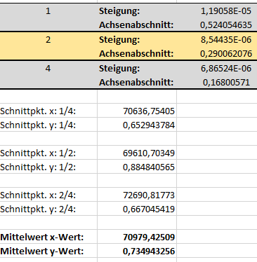 Michael F. schrieb: > Mit welchem Programm hast du diesen > Schnittpunkt errechnet? Mit einer Tabellenkalkulation. Du musst halt über 2 (möglichst weit auseinanderliegenden Punkten) die Steigung (a) und den y-Wert bei x=0 (y0) ermitteln, um die Geradengleichung aufzustellen y = y0 + a * x Dann nimmst du jeweils 2 Gleichungen und setzt sie gleich, um den Schnittpunkt zu ermitteln y0_a + a_a * x = y0_b + a_b * x Aufgelöst nach x ergibt das die x-Koordinate des Schnittpunktes x = (y0_b - y0_a) / (a_a - a_b) x des Schnittpunktes setzt du dann in eine der Geradengleichungen ein und erhältst y des Schnittpunktes. Das machst du für mehrere Kombinationen von Geraden und mittelst dann die Koordinaten des Schnittpunktes. Michael F. schrieb: > und > müsste bei neuen Daten das ja selbst errechnen... Solange die neuen Daten zu den 3 Beispiel-Geraden passen (ähnlicher Schnittpunkt) musst du an der Formel eigentlich nichts ändern.