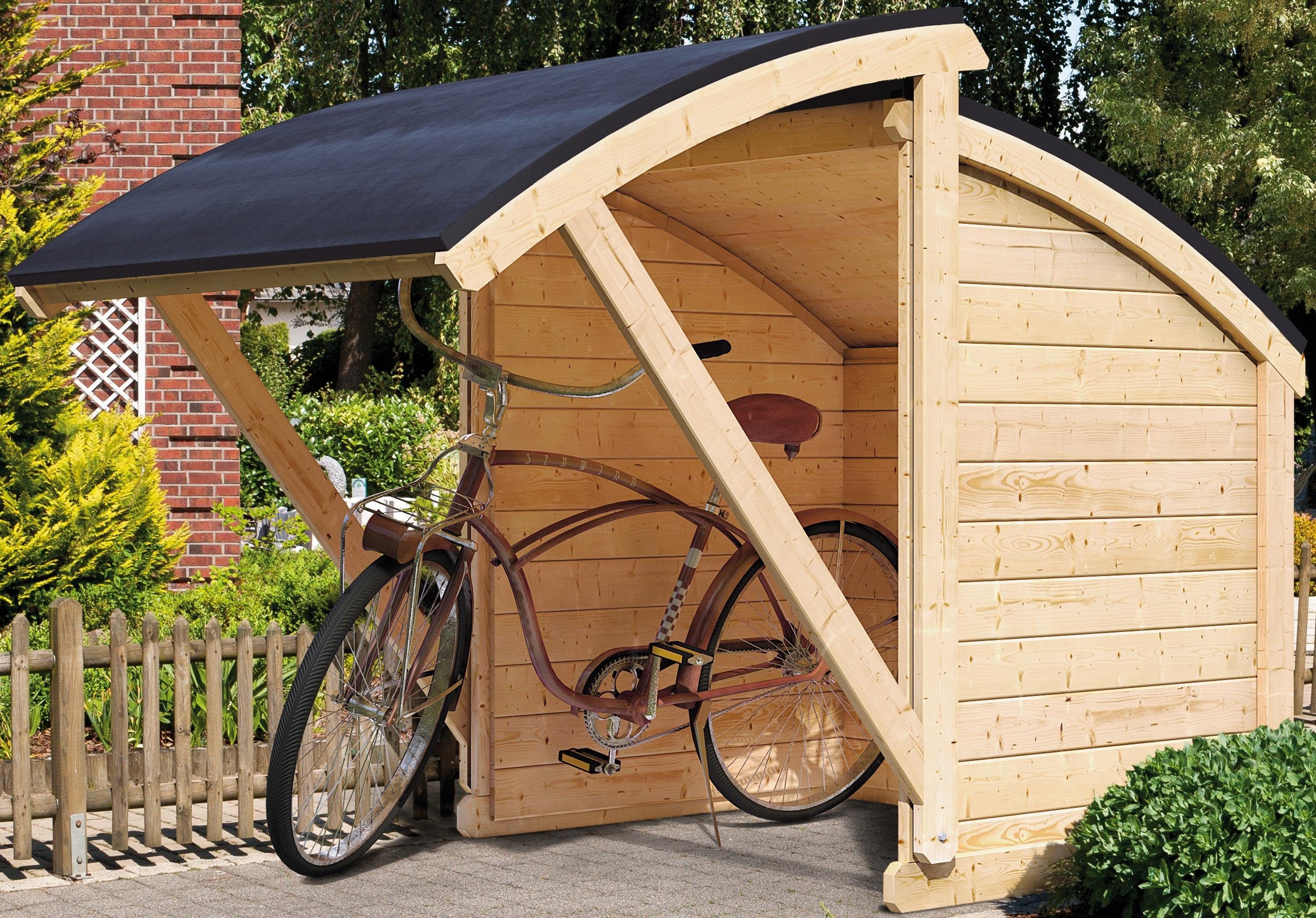 > Den Unterstand kannst du auch bequem selbst anfertigen. Dazu reichen > simple Werkzeuge (Kappsäge, Stichsäge, Akkuschrauber, paar > Handwerkzeuge), die du dir bestimmt irgendwo ausborgen kannst. Das würde ich nur im äußersten Notfall machen wollen. Erstens die Zeit für die Planung (wie hoch wie breit, wie muss ich jedes einzelne Brett zuschneiden, etc.), zweitens: > ohne Übung in Sachen Holzbau > wird der am Ende windschief und instabil sein. > "naturbelassen" - wie viele Jahre das wohl durchhält? Streichen oder mit Hartöl behandeln wird der Käufer übernehmen müssen (das setzt der Hersteller wohl voraus) > Ein Dach über dem Kopf reicht eben nicht, der Wind trägt das Wasser > seitlich ans Fahrrad und selbiges rostet dann munter vor sich hin, zumal > die delikaten Dinge, wie Zahnräder, Tretlager und Kette im unterern > Bereich angesiedelt sind, dort wo Spritzwasser hinkommt. Ein Dach ist immer noch besser als komplett im Regen stehend. Um das bisschen Spritzwasser habe ich mir keine Sorgen gemacht, schließlich kann man mit einem Fahrrad ja auch durch den Regen fahren ohne dass es einem gleich weg rostet. (im Winter bei Salz fahre ich aber nur noch mit meiner "Bahnhofsschlampe") > Wir kauften vor zwei Jahren eine Fahrradgarage bei fahrradgarage.de. "Fahrradgarage" ist ein sehr viel besseres Suchwort als die die ich bisher verwendet habe. fahrradgarage.de hat ein paar nette und auch schön kleine Konstruktionen (tatsächlich an einen Brotkasten erinnernd ;-) Leider sind die o.g. nicht ganz billig. Und ich hab mich in das Bild im OP verliebt ;-) Vielen Dank an alle für die konstruktive Diskussion.