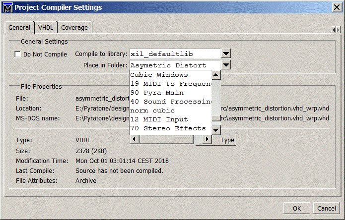 Rene Mariks Maulwurf würde jetzt sagen: "Nee, Nee, .... Nee, nix Simulationsscript" - "Fileliste"! Es geht um den file-Listen Abschnitt im MPF, der die Ordnerstruktur festlegt und irgendwie auch dazu dient, das Auswahlfeld im Modelsim zu füllen, anhand dessen man die Zuordnung zu den Ordnern festlegt. Das ist leider immer unsortiert und scheint irgendwie willkürlich. Manchmal tauchen neue Einträge weiter vorne auf, manchmal auch weiter hinten. Dazu reicht es nicht aus, nur die Liste zu sortieren und selbst wenn man das tut, stimmt es irgendwie nicht. Habe ich jetzt mal ausprobiert. Siehe Bild. Was das Compilieren angeht, müsste man dann auch alles Neue händisch eintragen. Dann könnte man besser komplett auf die Dateiverwaltung im ModelSIM verzichten und nur ein sript verwenden.