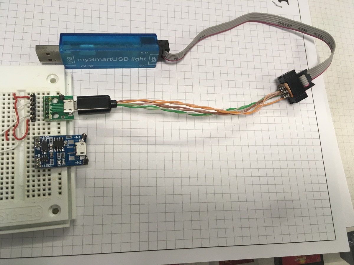 Ich hatte mal die selben Gedanken.., Meine Lösung - microUSB lötbarer Stecker (ebay im 5er Pack) Buchse mit Platine (ebay im 5er Pack) der 6. Kontakt ist mangels Lötbarkeit an die SteckerMasse (nennt man die so?) geklemmt! Also beim Zusammenbau reingeklemmt, bei Lötversuchen hab ich mir zuvor einen Stecker zerschmolzen :-( Adapter auf 6er ISP gebastelt ... und fertig mit PowerbankPlatine (parallel) lassen sich die Bastelprojekte programmieren UND laden ... äh... ODER ... also nicht gleichzeitig ... oder doch ? Hmmm.... grübel Wenn ich jetzt noch die Bilder vom iphone hier rein bekomme....