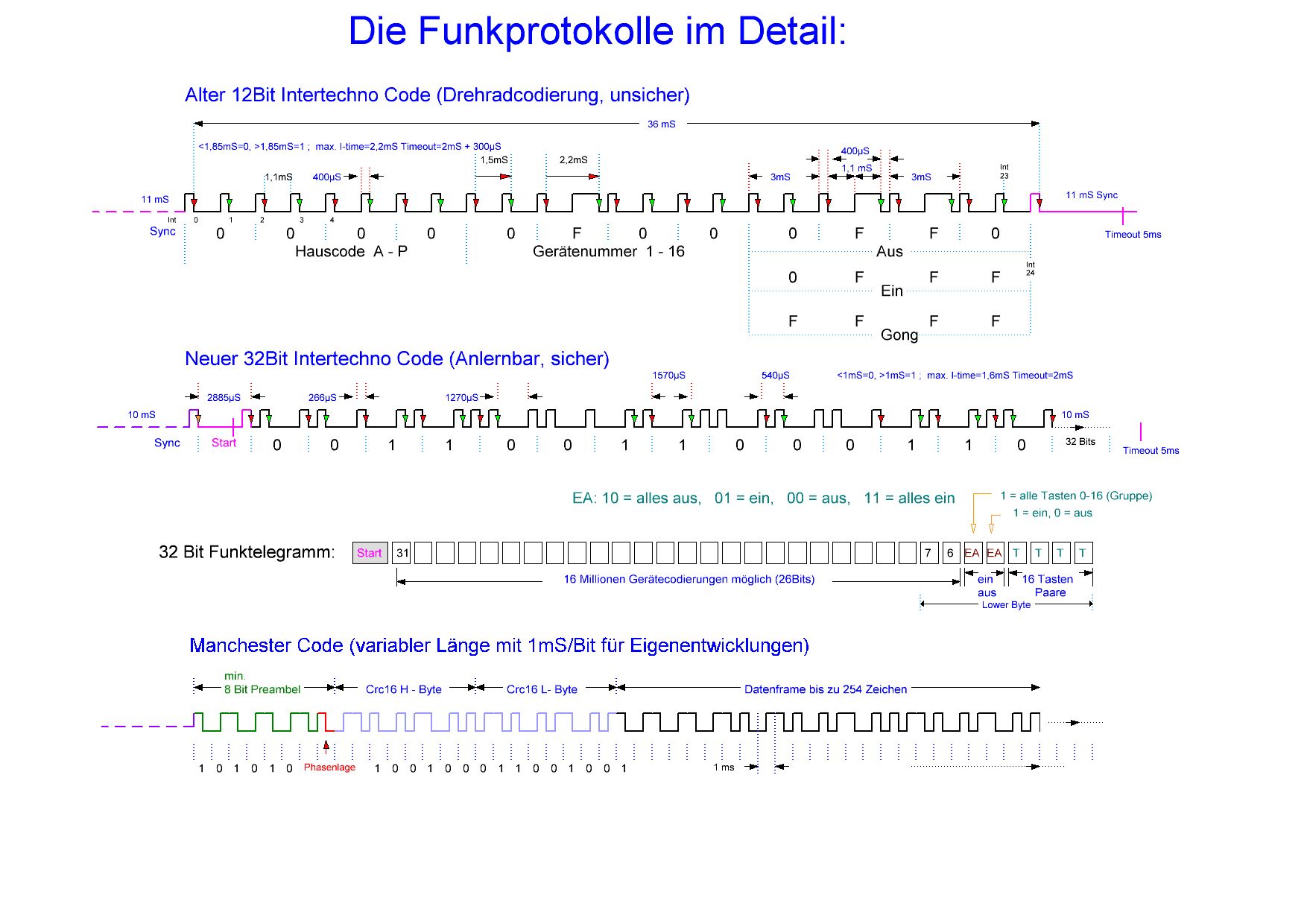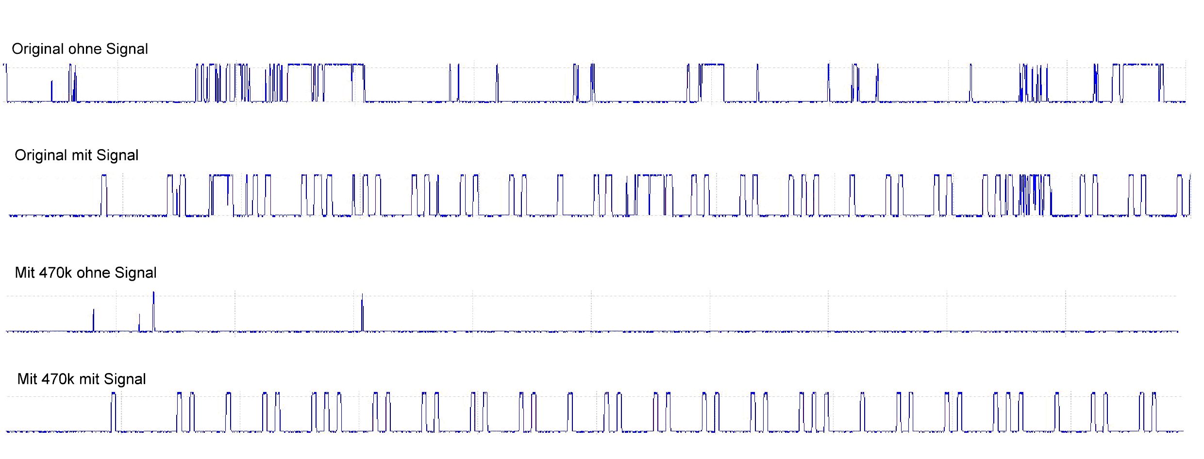 Hier die versprochenen Oszillogramme, wurden alle unter gleichen Bedingungen (Testsender, 1 Meter, ohne Antennen) aufgenommen. Interessant ist daß beim orig. Empfänger auch eine Annäherung des Senders bis zu 20cm fast keine Verbesserung der Bitfehler bringt. das scheint auch zu erklären warum beim Orig. eine Antenne kaum was bringt. Mit der Modifikation ist es so, daß bis zu einer bestimmten Entfernung ein sauberes Signal erscheint, wenig weiter gar nichts mehr. Natürlich gibt es viel bessere Funksysteme zum Spottpreis, aber mein ganzes Home-System sollte auch die (preiswerten)Intertechno Komponenten bedienen können. Habe in diesem Zusammenhang viel selbst entbickelt (SMS-Modem, Motorsteuerung, Alarmsender, auch der billig Rauchmelder aus dem Bauhaus alarmiert inzwischen per SMS. Das einzige Problem der geringen Reichweite wurde mit dem Umbau definitiv behoben!