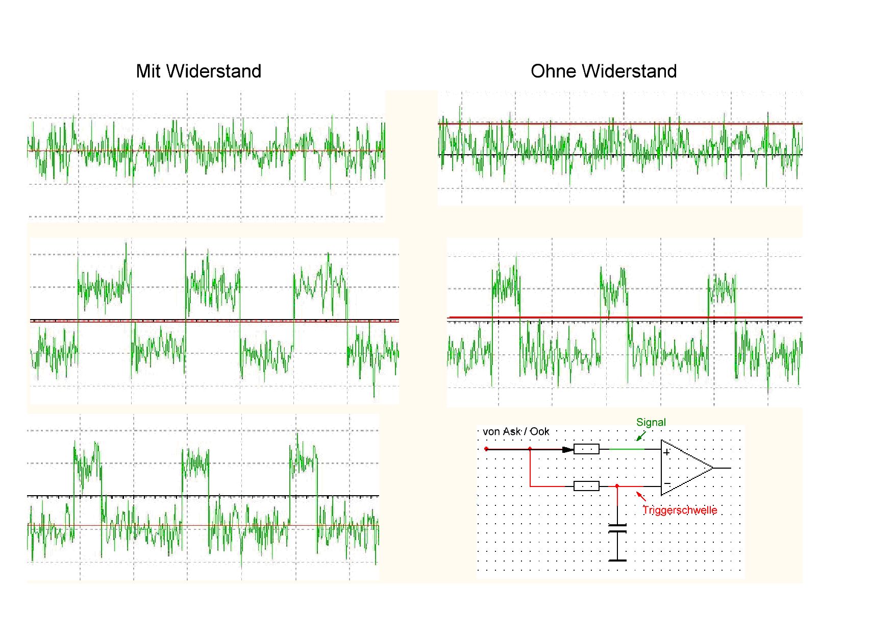 Noch ein paar Überlegungen. Die Intertechno Schaltsteckdosen verwenden einen simplen Pendelempfänger der neben den bekannten Nachteilen (Störstrahlung, Bandbreite,)eine sehr gute Empfindlichkeit aufweist. Den China Pendler kann´st vergessen - unbrauchbar warum? Die Empfindlichkeit der Superhet´s ist gut aber ich habe schon den Verdacht daß diese mit der Modulationsart nicht richtig zurecht kommen. (Impulse,nicht DC neutral) so etwas kann man auch über kondensatorgetrennten Leitungen nicht übertragen da hier der Pegel je nach Puls/Pause Verhältnis wegdriftet. Ein ähnliches Problem vermute ich hier beim Datenkomperator des PT4303. Daß ein Emfänger rauscht(analog) und eine Schwundregelung verwendet ist schon klar. Aber der Datenkomparator muß durch geeignete Ansprechschwellen ein brauchbares Digitalsignal generieren. Darum geht es beim Einsatz des Widerstandes.