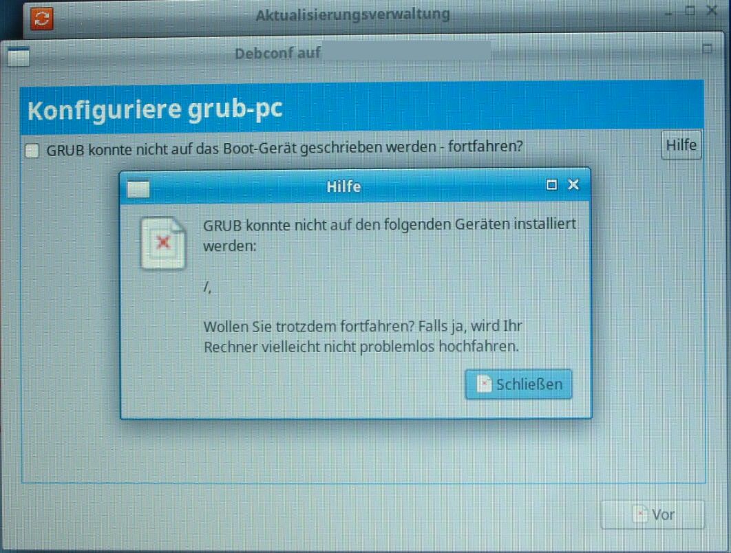 Sheeva P. schrieb: > Mutmaßlich war es ohnehin nur eine Warnung... Ich sah eine Meldung, wo zwei Geräte zur Auswahl standen und es wurde empfohlen, GRUB bei allen Geräten zu installieren. Bei jedem Gerät erhielt ich die Fehlermeldung (sinngemäß): Einrichtung nicht möglich. Es blieb nur die Wahl: "Weiter ohne GRUB". Irgendwas kann da nicht richtig sein, zumal dieser Halt bei einem zweiten identischen Gerät mit HDD nicht auftrat, hier lief das Update sauber durch. Hier befürchte ich bei einem späteren Update wieder Probleme.