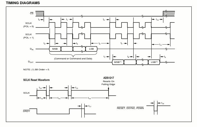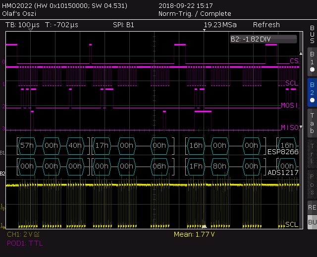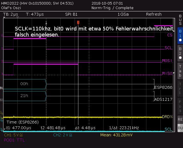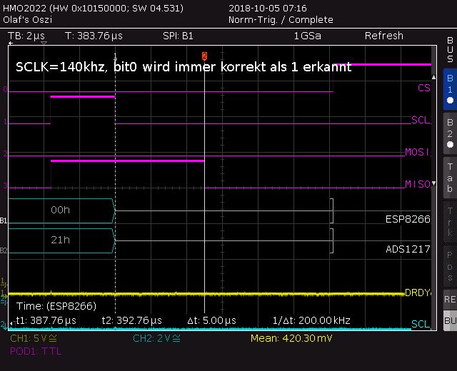 Ich versuche seit ein paar Tagen ein Problem mit der SPI Kommunikation zwischen einem ESP8266 und einem ADS1217 zu loesen und komme da Leider nicht recht weiter. Also dachte ich ihr loest mal eben mein Problem. :-) Der ADS1217 ist mit POL=1 verdrahtet. Damit sollte er im SPI-MODE3 laufen, das erste Bild zeigt einen ausschnitt aus dem Datenblatt wie sich TI das vorgestellt hat. Das Bild Oszi1.gif zeigt die Uebertragung sowohl des Logiganalyser wie auch nochmal das SCK-Signal auf dem analogen Eingang. Das sieht nach meiner Meinung so aus wie es laut Datenblatt aussehen sollte. Widerspruch? Der ADS1217 ist ein AD-DA Wandler der zusaetzlich noch einen 8Bit Datenport enthaelt. Um die Sache einfach zu halten beschreibe und lese ich erstmal diesen Datenport. Ich habe an den oberen drei Bits dieses Ports eine RGB-Led angeschlossen, D2 liegt auf high und alles andere auf low. Das Kommando 0x56 0x00 0x80 beschreibt als Beispiel den Port mit 0x80 und schaltet so z.B meine gruene LED ein. Ich gebe so einmal pro Sekunde immer abwechselnd 0x20 0x40 und 0x80 aus. Das sollte also dazu fuehren das die LED munter blinkt. Das tut sie aber in der Regel nicht. Sie blinkt manchmal garnicht, manchmal nur in einer Farbe und manchmal auch genau wie sie soll. Ignoriere ich einfach mal die Vorgaben laut Datenblatt und probiere alle Modi durch so kann ich in Mode0, was auf dem Oszi dann total falsch aussieht die LED korrekt und zuverlaessig ans blinken bringen. Lese ich dann aber testweise den Port ein so liefert der erste Versuch immer Unsinn und danach bekomme ich dann den richtigen Wert. Lese ich zwischendurch etwas anderes werden die reinkommenden Daten immer ander verwuerfelt. So kann es z.B sein das ich einen ADC-Wert lesen will, aber den den Inhalt des Portregisters bekomme wenn ich das zuvor versucht habe. Mit anderen Worten es sieht so aus als wenn keiner der vier moeglichen Modis funktioniert. Ich sollte vielleicht noch erwaehnen das ich am selben Anschluss, aber nicht gleichzeitig, vollkommen problemlos diverse Grafik-LCDs ans laufen bringen konnte. Schalte ich POL=0 bekomme ich genau dasselbe Ergebnis aber dann in anderen SPI_Modes. In keiner der acht denkbaren Kombinationen kann ich immer zuverlaessig lesen UND schreiben. Ich hab daher den Eindruck als wenn sich der ADS1217 nicht ganz an sein Datenblatt haelt. Hat schon mal jemand mit diesem IC (oder ADS1216, ADS1241, ADS1241) aehnliche Erfahrungen gemacht? Olaf