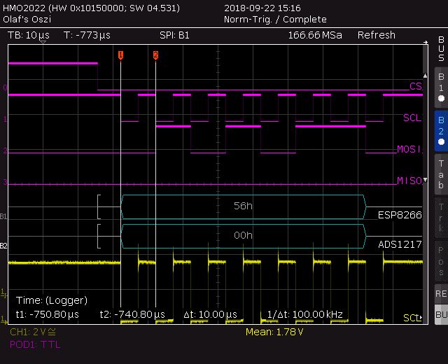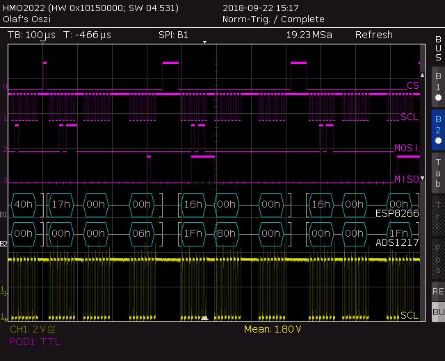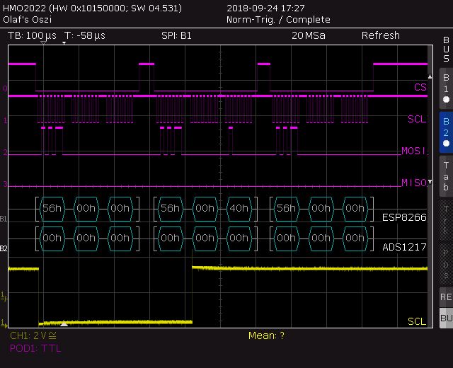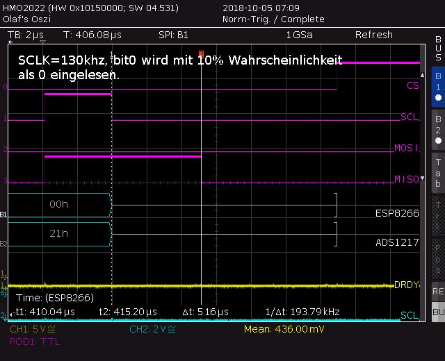 Ich habs jetzt zuverlässig und gut laufen. :-) Mein Problem war das ich zwei Bugs hatte. Der eine war eigene Bloedheit, ich hatte einen der Pinne (!DSYNC) fuer einen Ausgang gehalten und nirgendwo angeschlossen. ARGH! Nachdem ich den angeschlossen habe lief es erstmal, bis auf eine sehr faszinierende Kleinigkeit. Bei jeder Uebertragung kamen immer alle Bits korrekt im ADS1217 an, aber beim auslesen war Bit0 des jeweils letzten uebertragenen Bytes im ESP8266 immer 0. Egal was ich gelesen habe! Dabei sah auf meinem Oszi alles korrekt aus und wurde auch vom Oszi korrekt dekodiert. Die Loesung sah dann so aus: SPI.beginTransaction(SPISettings(SPI_SPEED, MSBFIRST, SPI_MODUS)); digitalWrite(CS, LOW); SendData = RREG | (RegisterNumber & 0x0f); SPI.transfer(SendData); //Schreibkommando für das gewünschte Register SPI.transfer(0x00); //0x00 bedeutet das wir ein Register lesen wollen delayMicroseconds(20); ReadData = SPI.transfer(0x00); delayMicroseconds(5); //DAS IST WICHTIG digitalWrite(CS, HIGH); SPI.endTransaction(); Aus Gruenden die mir ein echtes Raetzel sind braucht der ESP8266 zumindest mit dem ADS1217 eine kleine Wartezeit bevor er CS wieder hochsetzt. Dafuer kann ich mir keinen logischen Grund vorstellen weil das einlesen mit der Rueckkehr aus der transfer Methode bereits abgeschlossen sein sollte. Falls also jemand aehnliche Probleme hat empfehle ich ihn das mal auszuprobieren. Olaf