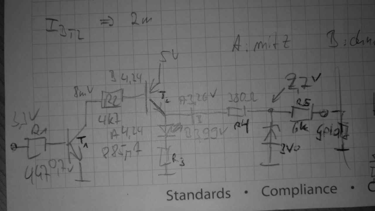 Moin folgendes Problem habe ich mit der angezeigten Schaltung T1 (NPN, BC547B) wird an der Basis angesteuert und schaltet durch. Über R2 (4k7) liegen etwa 4,2V. Der Ib von T2 (PNP, BC558B) liegt also bei etwa 900µA Im Fall A ist am Collector von T2 die LED und deren Vorwiderstand R3 geschaltet. R3 ist 470 Ohm Uled = 1,9V Ic ~ 5,8 mA Uc ~ 4,7V Im Fall B ist ZUSÄTZLICH R4 (380 Ohm) und die Zener-Diode mit 3V0 dort angeschlossen. Die Idee ist, bei durchgeschaltetem T2 sowohl die LED leuchten zu lassen, als auch die Uc ~ 4,7 Volt auf 3,0V zu begrenzen, um diese an einen GPIO-Eingang eines Raspi zu legen und dort zu verarbeiten. Tatsächlich passiert im Fall B folgendes: Uc des T2 fällt auf 3,7V Ic liegt dann bei 6,3 mA UBE des T2 verändert sich nicht, also auch nicht die Spannung über R2 und also der Ib von T2. Die Uz ist dann auch gerade eben nicht mehr 3V. ******************** Konklusion: Ib von T2 bleibt gleich Ic steigt nicht wie erwartet. Uc fällt (Der Innenwiderstand von T2 steigt??) Ich habe den R3 auf 1k2 Ohm geändert. Ib in T2 ist nun 5 mA. Jetzt bleibt Uc von T2 bei 4,7V, aber der Ib von T2 ist meines Erachtens VIEL zu hoch. Hfe des T2 sollte bei 200 liegen, Ib also viel kleiner sein. Ich verstehe nicht was da passiert. Insgesamt benötigt diese Schaltung gut 20mA eigentlich sollten es nur etwa 10mA sein. Der aufgesteuerte T2 sollte 10 mA an die Kombination LED und Z-Diode liefern, bei einem Ib von etwa 1mA. Tut er aber nicht. ******* Theoretisch könnte ich die LED und den R3 tauschen und die etwa 1,9V über der LED auf den GPIO-Eingang des Raspi legen (die Z-Diode weglassen, habe ich noch nicht probiert) Das müsste der Raspi auch noch als High erkennen und auch einigermaßen stabil und sicher sein. Aber ich wollte es quasi "richtig" machen. Was mache ich falsch? LG Ydalir