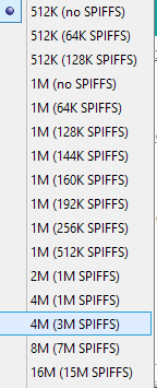 Hallo, in der aktuellen IDE gehen die ESP mit 512kB/1MB Ram auch ohne SPIFFS einzustellen, das mit den minimal 64kb war früher so. Gruß aus Berlin Michael