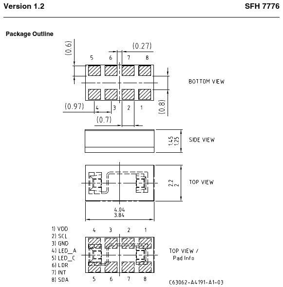Im APDS-9960 Datenblatt steht auf der ersten Seite "The slim modular package, L 3.94 × W 2.36 × H 1.35 mm, incorporates an IR LED and factory calibrated LED driver for drop-in compatibility with existing footprints." Osram baut einen kompatiblen Sensor (nur mit weniger Features) und zählt "normal". Pinbelegung und Footprint sind identisch, mit 0.97mm Pad-Abstand. Beim APDS-9960 komme ich aber auch auf 0.72 + 0.25 = 0.97mm.