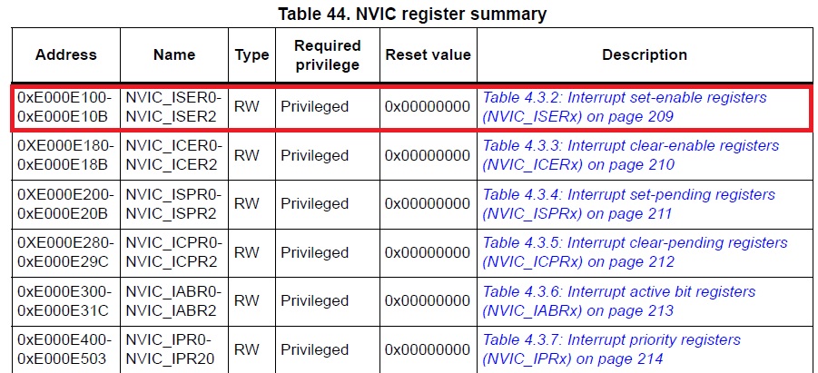 Steht doch da: Reset value 0x00000000, also 32Bit pro Register. Nach 32Bit / 4 Byte kommt dann das nächste Register mit wieder 32 Enablebits. #define NVIC_ISER0 0xE000E100 #define NVIC_ISER1 0xE000E104 usw