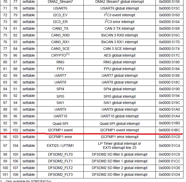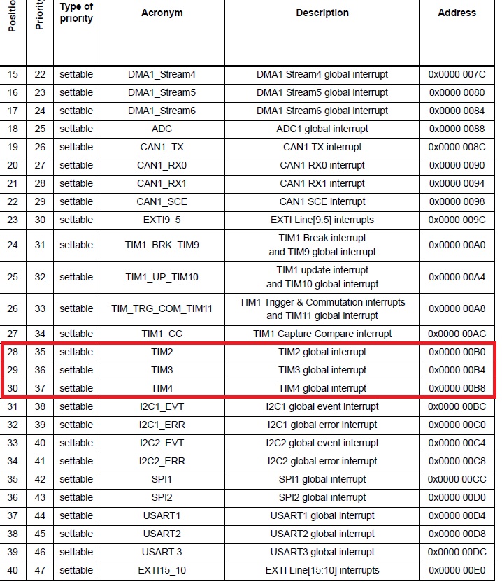 NUnja, mal wieder die Db Qualität von ST. "52 maskable interrupt channels (not including the 16 interrupt lines of Cortex®-M4 with FPU)" Aber in der Tabelle sins 101 IRQ Quellen. Die 52 Quellen passen natürlich in 2 Register, daher stehen auch nur 2 Register in dem anderen Paper. Beim Refman vom F205 steht zB was von: "81 maskable interrupt channels (not including the 16 interrupt lines of Cortex®-M3)" Die IRQ Quellen gehen dann auch bis Position 80.