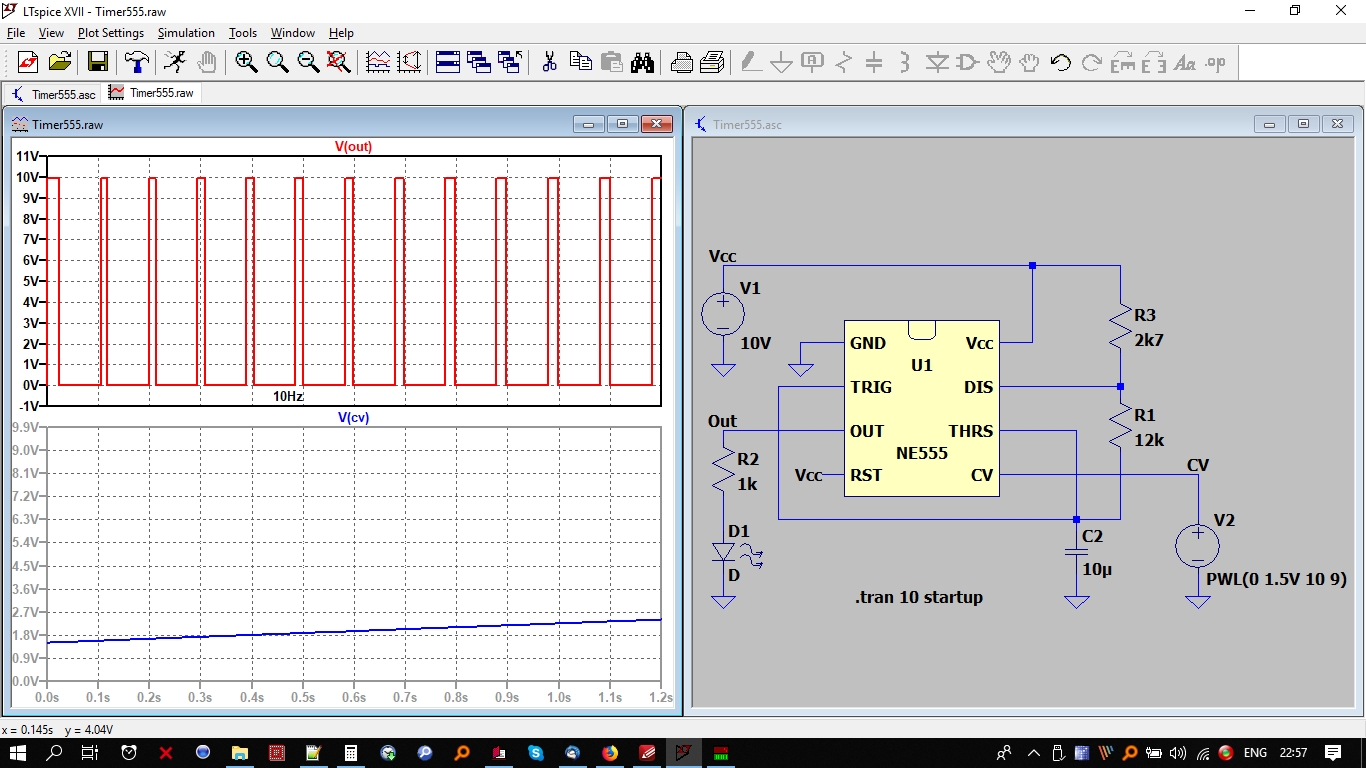 Der Vollstaendigkeit halber: Der "Frequenzhub" ueber Pin5 des Timer555 ist ziemlich eingeschraenkt und ausserdem aendert sich auch das DutyCycle. Hier ne Simulation fuer die, die es interessiert=> An Pin 5 wird eine ansteigende Spannung von 1.5V bis 9V angelegt.Die Betriebsspannung betraegt dabei 10V. Bei 1.5V hat man eine Frequenz von ca.3Hz bei 9V ca. 10Hz. Die Zoom-Bilder zeigen die DutyCycles bei 3Hz und 10Hz die sich durch die Frequenzvariation ergibt. Wer will kann ja mit LTspice weiter "rumkaspern" und eine fertige Loesung anbieten.Aber ein uC scheint wirklich die bessere Loesung zu sein....