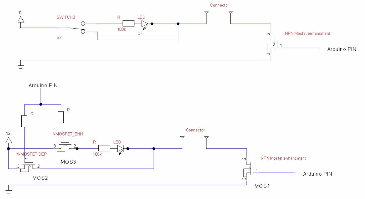 Hallo, Es geht um eine Steuerung und Überwachung einer mobilen Modellbau Eisenbahnanlage. NICHT die Züge, sondern die Umgebung! Verbraucher sind zu 80% 12V "Lämpchen". Dazu kommen ein paar 12V Induktoren (12v/1A) um diverse beweglichen Teile zu bewegen und ein paar Magnetspulen von Magnetventilen. Die können im Verhältnis zu anderen Verbrauchern mehr Strom ziehen. Generell sollte das Gerät pro Kanal 12V 5A schaffen. Zumindest plane ich 5A Sicherungen ein. Motoren für Winden und 12V LED Streifen sind auch geplant. In meiner Frage geht es primär mal um einen Kanal. Wenn ich den verstehe, wird die Vervielfältigung einfacher. Die Verbraucher sollen an das zu bauende Gerät gehängt werden, wenn die Anlage aufgebaut wird. Da die Anlage mobil ist, kann sich die Kanalbelegung ändern! Daher die Anlage des "Steckers". Ein Arduino schaltet die Geräte. Ich plane eine galvanische Trennung mittels Optokoppler. Ist vielleicht nicht notwendig, macht aber Spaß! Zusätzlich soll der Arduino eine Art Durchgangsprüfung beim Start der Anlage fahren und ausgaben, welche Lampe, Induktor oder generell Verbraucher "durchgebrannt" ist. Andere Fehler kann ich mit einer einfachen Durchgangsprüfung kaum aufspüren. Für diesen Fall soll der Arduino pro Kanal auf die LED-Strecke umschalten, Durchgang messen, LOW/HIGH zurückgeben und wieder zurückschalten. Je nach Ergebnis wird die Anlage freigegeben oder nicht. Die ursprüngliche Idee einer "generellen permanenten" Prüfung habe ich verworfen. Der Plan wäre gewesen, dass bei defekten Zugübergangslampen der Zug automatisch umgelenkt wird. Das wurde mir auch programmiertechnisch in Bezug auf die digitale Steuerung zu komplex. Vielleicht kommt das später dran, wenn ich die Grundlagen mal erledigt habe. Daher geht es jetzt um "entweder/oder"! Ein neuer Thred deshalb, da es hier auch um eine komplett andere Frage geht, nämlich um die Realisierung eines MOSFET UM-Schalters! hatte ich am Ende des letzten Thred auch so angegeben. Ich könnte mir natürlich mehrfache 8 Fach Relaiskarten kaufen. Das macht jedoch keinen Spaß und der Lernerfolg ist gleich null. Ich möchte im Zuge der Entwicklung auch gerne etwas dazulernen. Daher möchte ich, zumindest am Steckbrett die Schaltung von Grund auf bauen. In weiterer Folge sind mehrfach Treiber sicher eine Idee, da ich letztendlich irgendwann viele Kanale haben möchte. Im Zuge diverser Überlegungen, bin ich bei der Realisierung eines reinen UMSCHALTERS stecken geblieben. Da die Idee eines Umschalters auch bei anderen Projekten interessant sein könnte, habe ich genau danach gefragt. Die LED Strecke immer angeschlossen zu lassen und nur die direkte Laststrecke zu schalten, wäre demnach auch kein Umschalter! Die Idee wäre, einen klassischen ON/ON Kippschalter mit MOSFETS zu realisieren, sodass einerseits höhere Ströme je nach Auslegung möglich wären, der jeweils andere Strang tatsächlich stromlos wäre und das ganze von einem Arduino geschaltet werden kann.
