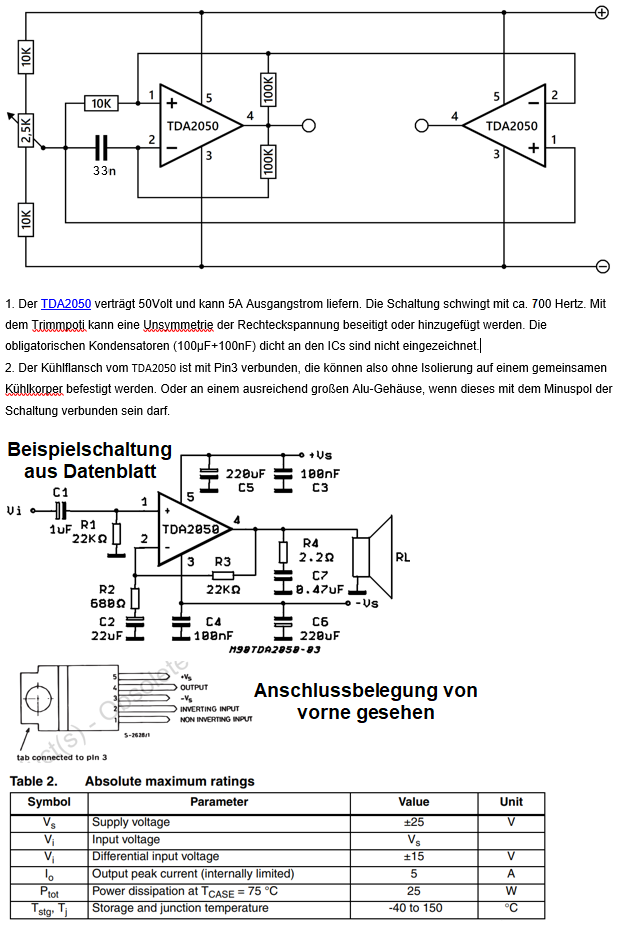 Hallo. Hast du denn schon eine Lösung aus den TDA2050 gebaut ? Läuft das ganze jetzt ? Ich habe aktuell das gleiche Problem Gruß