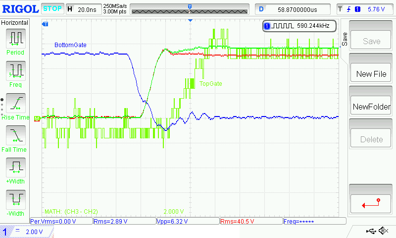 Kannst du die Totzeit von den beiden FET beeinflussen, so dass du ihn etwas schneller ausschaltest und etwas langsamer einschaltest? Verglichen mit dem Datenblatt bist du recht nah am shoot-through. Im Datenblatt sind nur typische Werte für trise/fall und delay angegeben, aber keine maximalen Werte.
