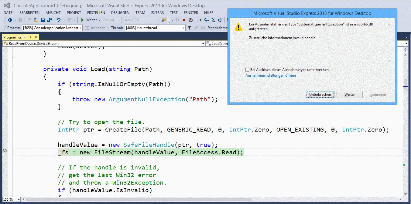 Arc N. schrieb: > Da es nur um Sektoren einer SD-Karte geht, reichen die höheren > Funktionen, wie schon geschrieben wurde, aus: > https://stackoverflow.com/questions/38190/how-do-i-read-a-disk-directly-with-net Das Programm von Stackoverflow habe ich versucht zu compilieren (siehe Anhang). Im ersten Teil (using ..., namespace ReadFromDevice) sind keine Fehler. Im zweiten Teil (Main) sind 10.