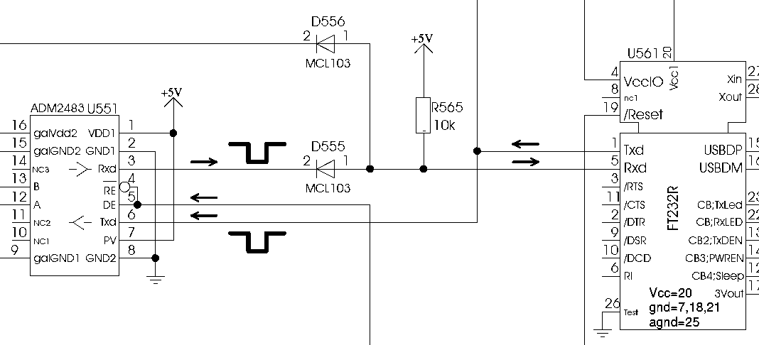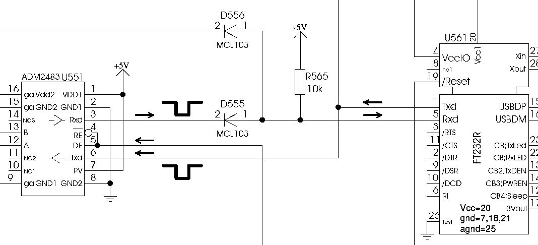 Hallo, > Daniel U. schrieb: > Je nach > Anwendungsfall wird er also über die Buchse umprogrammiert oder er > kommuniziert mit einem anderen Chip. Wenn der USB to UART-IC nicht benutzt wird, kann die UART auch anderweitig kommunizieren. Vom uC senden über Txd geht immer in mehrere Richtungen. Die Rxd-Leitung muß aber umgeschaltet oder entkopplelt werden. Entkoppeln geht am einfachsten über eine Dioden, so wie im Bild mit D555 und D556. Der Pullup-Widerstand R565 ist zwingend notwendig. Der Wert sollte an die max. Baudrate angepasst werden. > Soweit ich verstanden habe kann ich dafür aber nicht einfach noch so > einen IC auf die Seite des 2. Chips setzen, da diese ICs nur dafür > ausgelegt sind von USB zu UART zu konvertieren aber nicht noch > gleichzeitig andersrum. > Was gibt es da für (vor allem kleine, platzsparende) Lösungen? Welche physikalische Schnittstelle du zu den anderen Teilnehmern nutzen willst, ist eine andere Sache. Für kurze Entfernungen geht das auch mit TTL-Pegeln. Für längere Leitungen wäre z.B. RS485 oder RS422 möglich. Gruß Öletronika