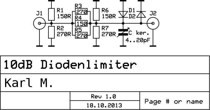 Hallo, hier ist noch der Schaltplan des 50R -10dB Dioden Limiters. Die gemessenen Portanpassungen S11 sind hier zu sehen: 20131018-S11-Port_Anpassung.pdf