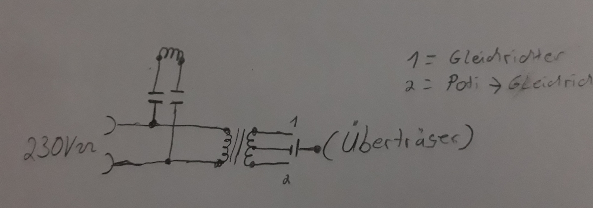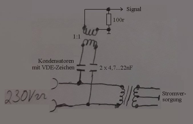 Der untere Trafo ist nur für die Stromversorgung geeignet. Der obere Übertrager sollte auf ein geeignetes Ferritmaterial gewickelt sein. Evtl. get auch eine stromkompensierte Drossel mit ca. 2x100µH. An dieser Stelle auf die Sicherheit achten. Die beiden Kondensatoren kann man aus einem alten Schaltnetzteil ausschlachten. Es sollten VDE-Zeichen drauf sein. Die Sekundärseite des Übertragers sollte mit der Gerätemasse bzw. Schutzleiter verbunden werden.