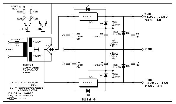 Hi, D5 und D6 findet man als Verpolschutzdioden oft in deratigen Plus-Minusspannungsversorgungen mit gemeinsamem GND Anschluss. Damit wird verhindert, dass bei Drahtbruch Spannung mit falscher Polarität in das "falsche" IC zurückfließt. Die Dioden an Adjust sollen auch vor Verpolung schützen, fehlen aber oft. Ist nur eine zusätzliche Sicherheit. Aber schau Dir einmal oben links die Schalterstellungen an. R3a und R3b. Deswegen noch Dioden! Wenn nämlich die Adjust-Widerstände fehlen, hängt der Anschluss nicht auf falschem oder verpoltem Potenzial. Dazu dienen dann die Dioden D3 und D4. Habe es selbst ausprobiert, das hat man oft an den Netzteilen mit den Spannungseinstellungen. Es macht dem IC normalerweise nichts aus, wenn Adjust beim Schalten kurz weg ist. Dann geht die Spannung am Ausgang normalerweise auf Null. Und C5 und C6 puffern die "Umschaltpause" noch ab. Aber dienen in erster Linie zur Verbesserung des Regelverhaltens. Aber Vorsicht, ich würde es nicht machen wollen. Also, immer Netzstecker raus, dann Spannungswähler umschalten. Und die Reversdioden D1 und D2 verhindern bei Spannungen über 7V, dass bei Einbruch der Spannung am Ladeelko das IC nicht auch revers betrieben wird. ciao gustav