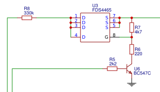 Hier wird unnötig Energie verbraucht. Die Widerstände rund um den BC547 könnten um den Faktor 10 oder mehr vergrößert werden. Ein kleinerer MOSFET würde dann immer noch schnell genug schalten.