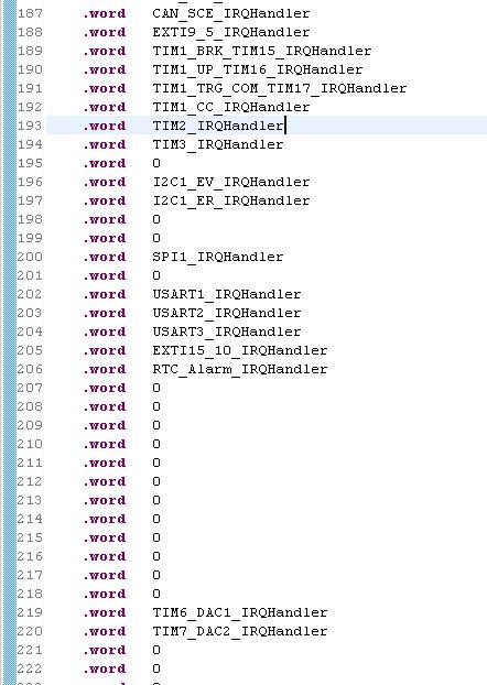 Hallo, ich habe das Problem, dass bei mir der TIM3 und TIM15 nicht funktioniert. Ich arbeite mit der System Workbench IDE. TIM2 funktioniert hingegend einwandfrei. Mit genau denselben Einstellungen funktionieren aber TIM3 und TIM15 nicht. NVIC_ISER Interrupts aktiviert, ebenso APB1\APB2 clocks. Im startupt File taucht TIM15 komischerweise nichtmal auf. Der Debugger kennt übrigens TIM3 nicht. Also irgendetwas passt da anscheinen gar nicht. Wenn ich das startup file mit den CUBEMX generiere, ist es übrigens identisch, auch hier sucht man TIM15 vergebens. Hier ist ein Auszug aus den Startup File. Soll\Muss man da jetzt selber die Timer reinschreiben ????