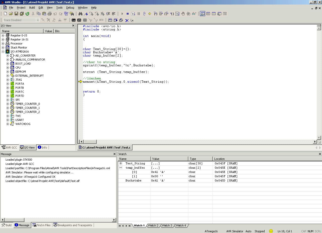 So, nun habe ich mein compiliertes .elf File mit dem AVR Studio geöffnet und möchte damit debuggen. Ich habe AutoStep gedrückt, und gesehen wie er die ganzen Ausdrücke durchspringt, aber nun hängt er schon ne Ewigkeit in einer for-Schleife, die bis 50000 hochzählt (unten am Rand steht aber "Running" und das JTAG blinkt ganz schnell). Leider sehe ich in der linke Spalte nur die Register Info und Projekt, aber nirgends kann ich sehen, was nun wirklich die Pins und Register von meinem ATmega sind. Was mach ich falsch?