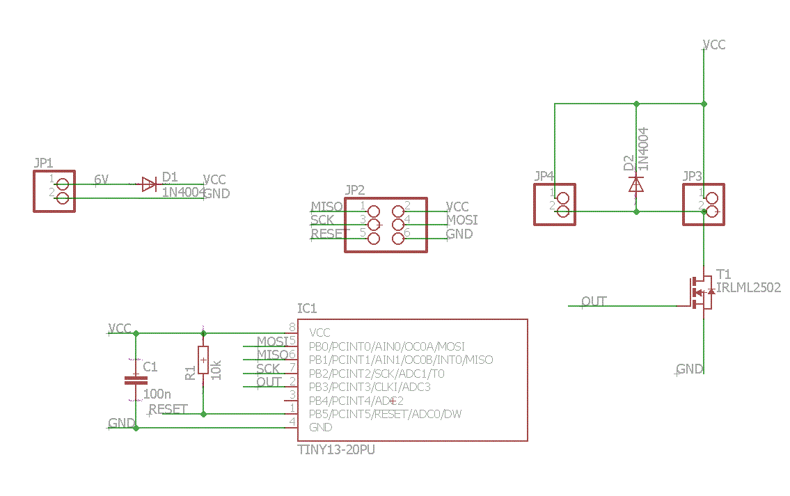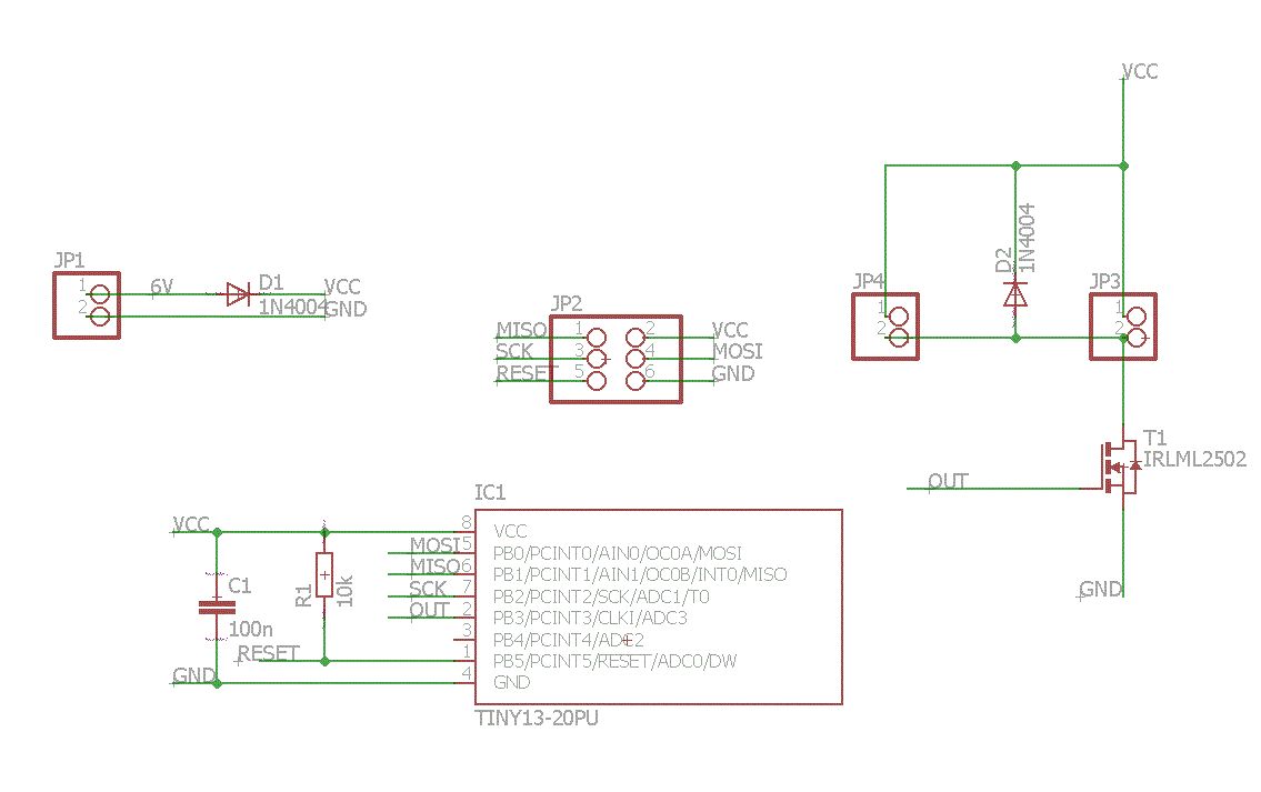 Hallo auch, meine Frau brauchte eine kleine Schaltung, die zwei kleine Lüfter in regelmäßigen Abständen laufen lässt - so 5 Minuten alle Stunde. Ich habe also mal geschaut, was ich noch so rumfliegen habe und habe dann folgende Schaltung zusammengewürfelt. Betrieben wird das Ganze über vier AAA Batterien- daher die Diode D1, um die 6V auf ein erträgliches Maß für den Controller zu drücken. An den Jumpern J3 und J4 hängt nun je ein kleiner Lüfter (70mA bei 5V). Nun zeigt sich ein drolliges Problem - das Ganze funktioniert bestens, solange nur ein Lüfter angeschlossen ist. Hänge ich beide an, tut sich nichts mehr. Ich habe nun leider nicht die Möglichkeit, den Anlaufstrom zu messen, aber die Dinger sind wirklich klein und der IRLML kann ja deutlich mehr ab. Was übersehe ich da, bzw. wo kann ich ansetzen?