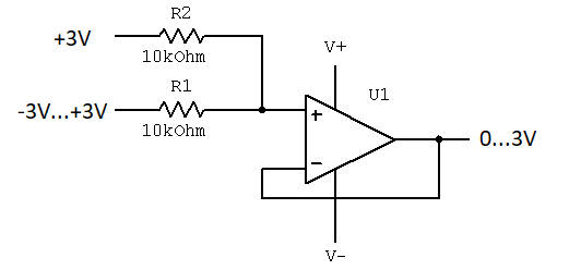 Addierer klingt gut, erst 1:2 Spannungsteiler, dann 1.5V oder besser 1.65V addieren, man kann zwar -3V...3V auch durch einen Spannungsteiler 10k:10k zu 3.3V in 0.15V...3.15V umsetzen, aber dss erfordert eine referenzgenaue 3.3V Spannungsquelle.