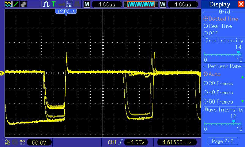 Moin, ich bekam neulich eine Bürolampe in die Hände mit einem SNT. Ich vermute mal es handelt sich um diese Schaltung: http://www.joretronik.de/Web_NT_Buch/Kap13_2/Kapitel13_2.html#13.2.3 Ausgangsspannung ist 11,9 V AC 60 VA ca 32kHz, ich hatte mal eine Diode ganz unbedarft in Reihe geschaltet um die Helligkeit zu reduzieren. Die Lampe glimmt aber nur. Dann habe ich mir mal das Ausgangssignal angesehen; siehe Anhang. (ohne Diode) Meine Frage wäre: kann ich die Helligkeit so überhaupt sinnvoll reduzieren? So wie ich die Schaltung sehe vermutlich nicht; wahrscheinlich alles wieder so gerade eben zusammen gestrickt. Andere Frage am Rande; woran liegt es, dass ich kein klares Bild bekomme (alles doppelt und dreifach). Oszieinstellungen? Messaufbau (nix unverfängliches)? Oder ist eben so, Ausgangsspannung nicht wirklich stabil, aber für eine Glühlampe reicht es.