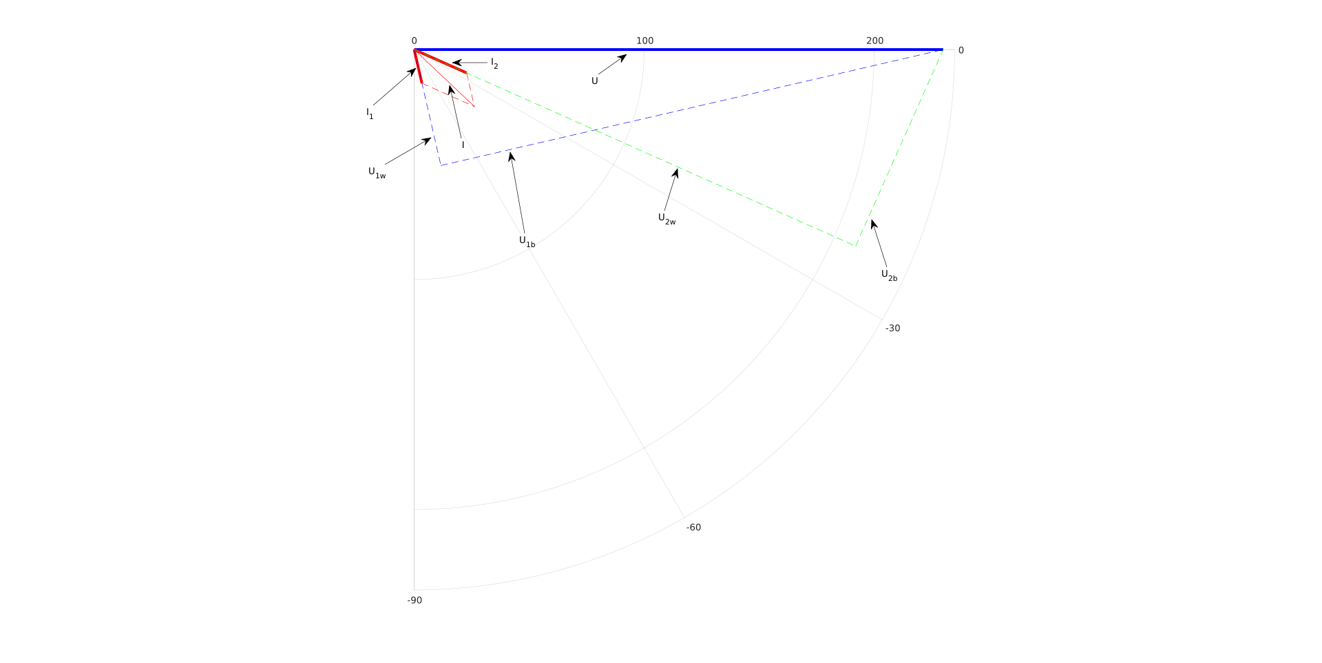 Aus Bequemlichkeit rechnen wir fortan mit Effektivwertzeigern und lassen das sqrt(2) weg. Außerdem verzichten wir auf j*2*pi*50Hz*t im Exponenten weil wir wissen, dass es sich um ein lineares System handelt und alle Zeiger sich mit den gleichen 50Hz drehen. Fortan betrachten wir also keine Drehzeiger sondern feststehende Zeiger mit festem Phasenverhältnis.