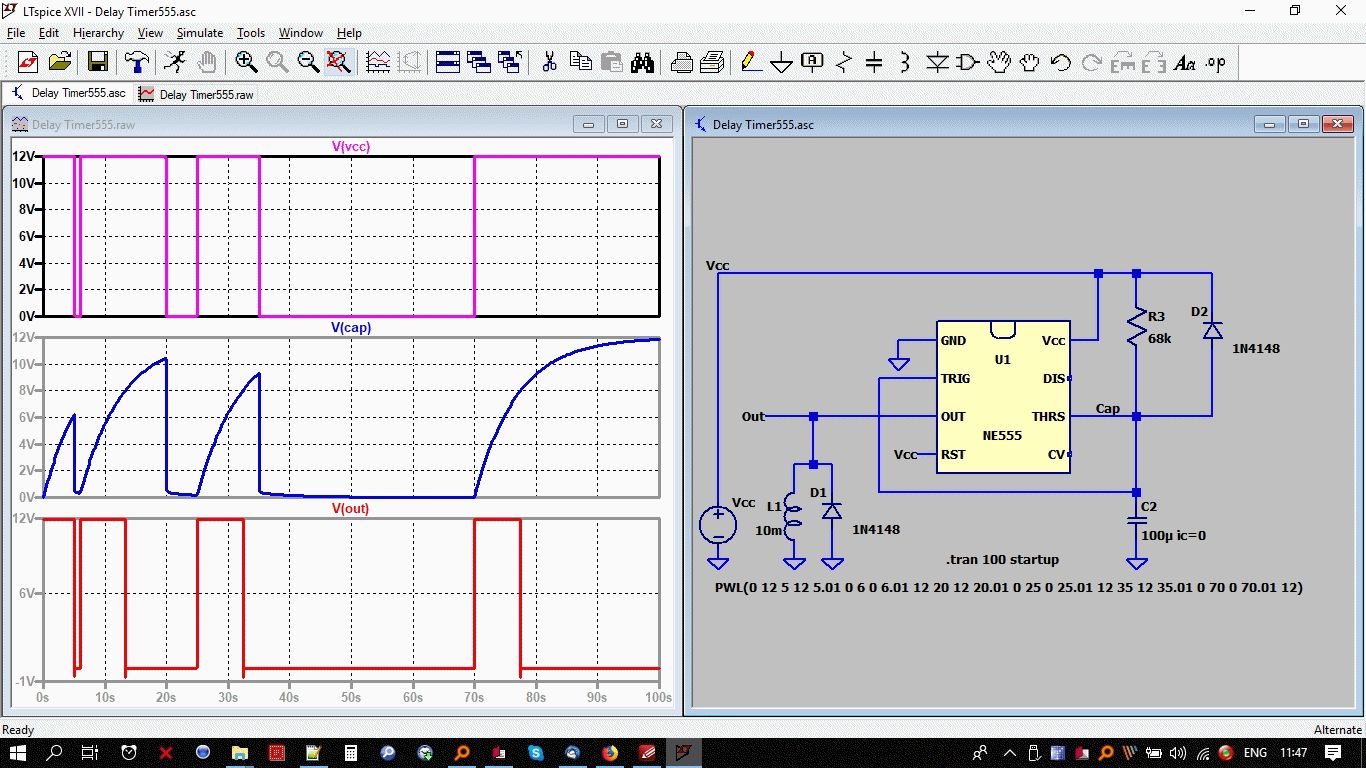 Mani W. schrieb: > Einige Sekunden lassen sich damit locker machen ohne Elektronik... Im Grunde genommen hat diese Schaltung fuer einfache Anwendungen wo keine hohe Stroeme geschaltet werden auch ihre Berechtigung.Allerdings wird bei dem von TO angegebenen Relais(960 Ohm) mindestens ein Elko von 10000uF erforderlich sein und da ich heute meinen LTspice-Tag habe gibt es dazu natuerlich auch eine Simulation ? Nach etwa 5s ist die Spannung am Relais auf 7V abgefallen.Das duerfte so in etwa der Haltewert sein (und auch der kritische Moment,wo die Kontakte gegebenfalls Funkenbildungen ausgesetzt sind) Nun denne: Aufbauen und testen....