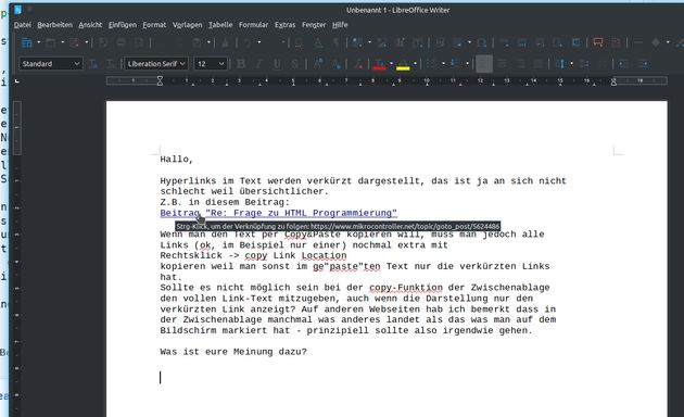 Christian M. schrieb: > Bernd K. schrieb: >> Christian M. schrieb: >>> Hat wahrscheinlich mit der Bitte für >>> das Kopieren von Links zu tun. >> >> Den href eines Links kann man auch kopieren wenn der verlinkte Text >> gekürzt ist oder anders lautet, jeder Browser kann das, also warum? > > Beitrag "Cop<%Paste mit vollständigem Link möglich?" Mal eben getestet: Text markiert, kopiert, beispielhaft in Libreoffice eingefügt und siehe da, der Link ist blau und hat sein href mitgenommen. (Siehe Anhang) Der Browser setzt den Linktext samt Metainformationen in die Zwischenablage. Es ist also nur ein Problem des pastenden Programmes dieses einen Nutzers das der vielleicht nur einmal im Leben hatte, und darunter sollen jetzt und in Zukunft alle 99,99999% übrigen Forennutzer leiden weil alle Threads jetzt 2 Meter breit sind und einen riesen horizontalen Scrollbalken bekommen? HTML-Text kann Links enthalten und der angezeigte Text kann vom href abweichen. Das war von Anfang an ein Teil dessen wie das www funktioniert und hat seinen guten Grund. Niemand hatte je ein Problem damit. Es gibt keinen Anlass jetzt plötzlich das html und Sir Berners-Lee's großartige Idee stückweise wieder abzuschaffen und zu verkrüppeln bis nur noch Plaintext übrigbleibt. Bitte diese Änderung wieder zurücknehmen, sie lässt sich nicht begründen.