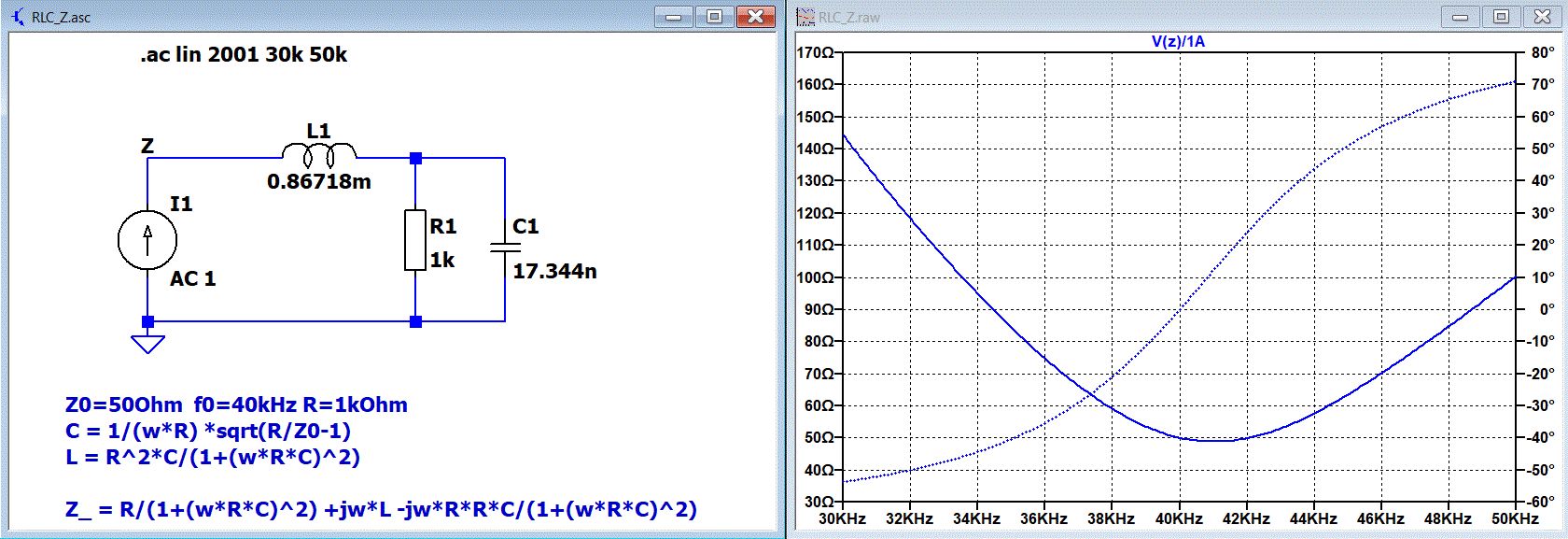 miro_ schrieb: > Der Zweipol soll bei 40 kHz den Widerstand Z=50Ω+j0Ω haben. R=1kΩ > Bestimmen Sie L und C. Die einfachste Methode wäre den 1k Widerstand auszugliedern, diesen als externen Lastwiderstand zu betrachten und das übrig gebliebene LC-Glied als einfache Anpassschaltung 50Ohm zu 1kOhm anzusehen. Zuerst die Netzwerkgüte Q (Q²+1=1000/50) berechnen und danach die notwendigen Blindwiderstände XL=Qx50 und XC=1000/Q bestimmen. miro_ schrieb: > Ist das ein Schwingkreis mit Resonanz bei 40 kHz, weil ϕ=0? Das gesamte RLC-Netzwerk ist auf 40kHz resonant. Betrachtet man nur die Resonanzfrequenz des LC-Anpassgliedes so liegt diese etwas über 40kHz (hier ca. 41kHz), erst die Bedämpfung der Schaltung durch den Lastwiderstand führt zur gewünschten Resonanz bei 40kHz.