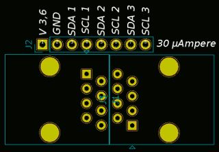 Also, ich möchte 2 RJ45 Buchsen miteinander verbinden. Die Pins sind recht nahe beieinander. Also durch schleifen. Allerdings möchte ich auch jede Bahn abgreifen. Ich nutze das um mehrere baugleiche I2C Sensoren mit einen Kabel zu verbinden. Nicht für eine normales Netzwerk. Es dient als Verbindung zu einem Arduino. Zwischen den Sensoren können einige Meter Kabel sein. Ich habe die Befürchtung das ich den dritten Sensor nicht mehr erreiche wenn ich die ich die Verbindungen zu dünnen machen. Mit 0,6 mm geht es in KiCad. Die Dicke der Kupferschicht ist 1 oz. Siehe Bild.