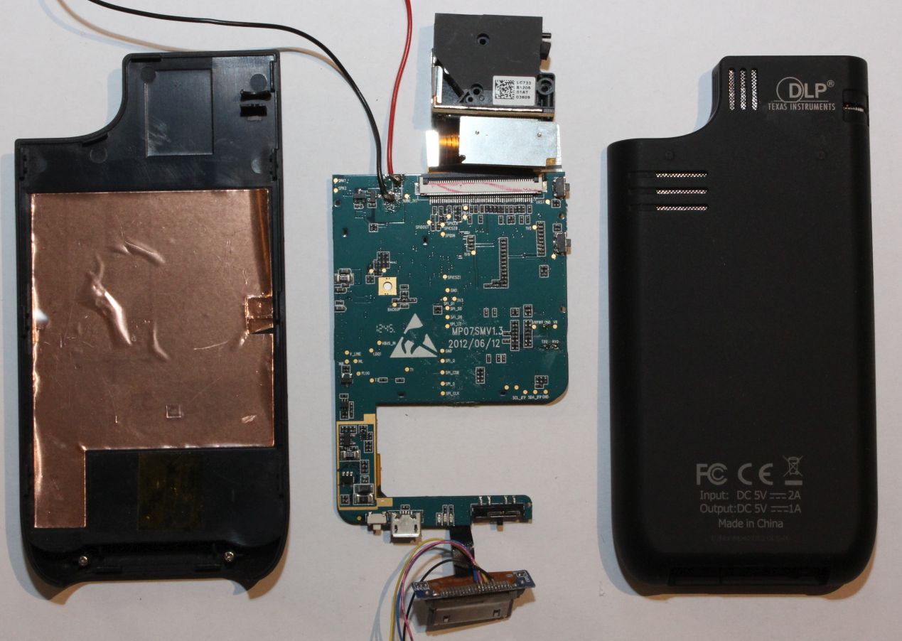 So, hier das Innenleben von meinem Telstar MP07, vermutlich baugleich. Ja, das iPhone braucht es nicht, sobald man ein Composite Video füttert zeigt er das an. Beim Top-Bot der Platine stehen schon ein paar Pins dran die ich rausgefunden hatte, reinzoomen. Zu einigen der ICs findet man Datenblätter und Infos, zB: Das DLP-Projektor Ende ist sehr ähnlich zum Beispiel-Design von TI mit DLP-Prozessor und LED-Treiber von TI. http://www.ti.com/lit/ds/symlink/dlpc2607.pdf Der Telstar IC soll den Akku laden und Spannungen bereit stellen, der scheint bei mir wie gesagt einen Knacks zu haben. Der abgefräste IC ist definitiv von Terawins, ich habe viel im Internet gestöbert und vermute ein Terawins T123, aber bin nicht 100% sicher. Er hat eine serielle Schnittstelle, da spuckt er auch etwas aus was auf ein Terawins SDK hinweist. (Finde das Datenblatt gerade nicht wo ich das her habe). Dieser IC kann prinzipiell auch SVideo und so, soweit ich weiß.