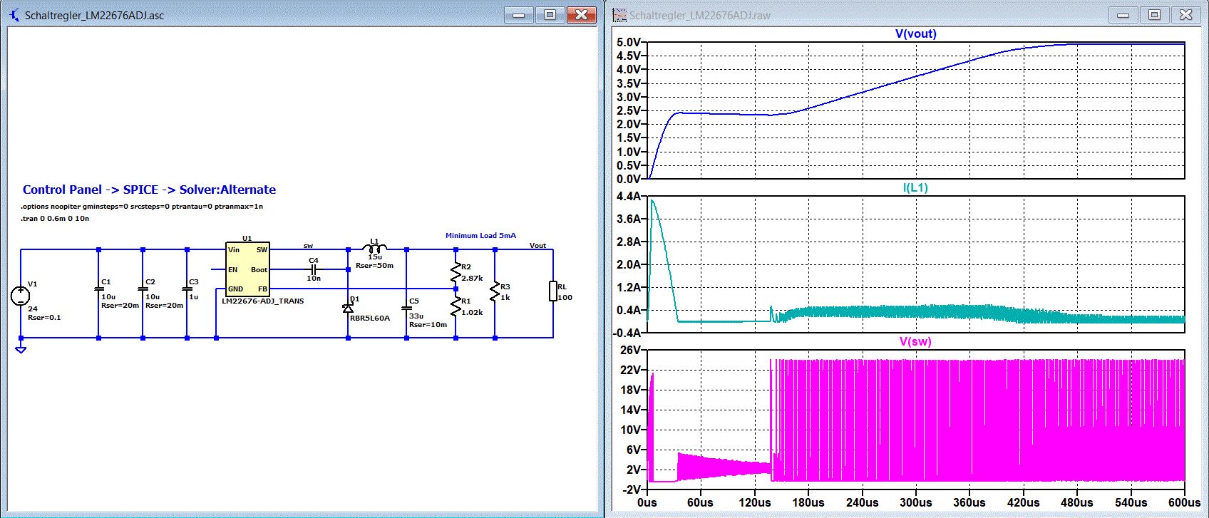 Hallo Lukas, die Schaltung benötigt den Alternate-Solver. Control Panel -> SPICE -> Solver:Alternate Da keine der Methoden zur Arbeitspunktfindung klappt, muss man entweder alle Methoden manuell mit der ESC-Taste überspringen oder das Gleiche durch eine Kommandozeile erledigen. .options noopiter gminsteps=0 srcsteps=0 ptrantau=0 ptranmax=1n Danach startet LTspice im Blindflug mit der .TRAN Analyse. Der Nachteil ist, dass dadurch die Simulation am Anfang unter Umständen nicht dem entspricht was man eventuell erwarten würde. Das betrifft hier die ersten 150us. PS: Die Diode hatte in deiner Schaltung gefehlt. Am Symbol habe ich Pins vertauscht damit die besser in den Schaltplan passen. So ein Schaltplan ist wie eine Visitenkarte. Deshalb lohnt es sich immer den Schaltplan verständlich und zumindest mit etwas Hingabe zu zeichnen.