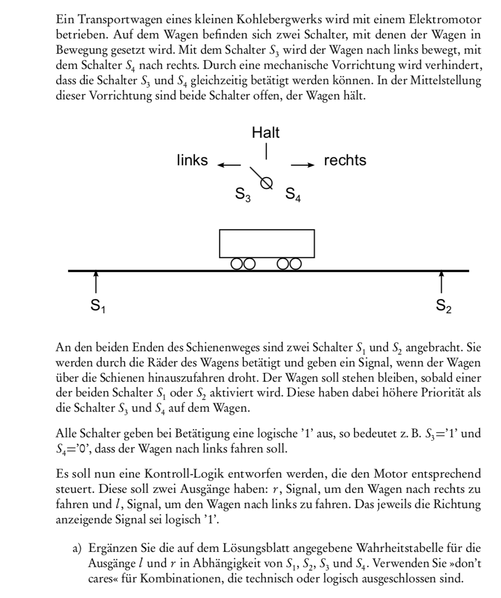 Es gibt doch nur zwei Bedingungen: l = s3 AND (NOT(s1)) r = s4 AND (NOT(s2)) Ausgeschlossen sind ferner (s3=1 AND s4=1) durch mechanische Verriegelung, sowie (s1=1 AND s2=1) durch die Physik, da sich der Wagen nicht an zwei Punkten gleichzeitig befinden kann. Auflösen mußt Du aber selbst.