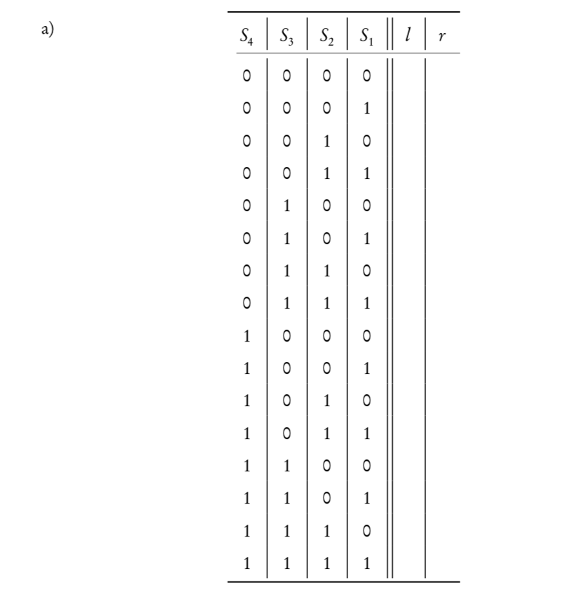 Hi Leute habe gerade Schwierigkeiten bei dieser Aufgabe: Habe mal die Tabelle versucht : Wie soll ich das genau mit dont Care machen ? Stimmt meine Tabelle oder sind Fehler drinnen ? Bitte um Tipps S4 . S3 S2 S1 l . r 0 0 . 0 0 0 . 0 0 0 0 1 0 0 0 0 1 0 0 0 0 0 1 1 0 0 0 1 0 0 1 0 0 1 0 1 1 0 0 1 1 0 1 0 0 1 1 1 1 0 1 0 0 0 0 1 1 0 0 1 0 1 1 0 1 0 0 1 1 0 1 1 1 1 0 0 1 1 0 1 1 1 1 0 1 1 1 1 Würde das so gehen?
