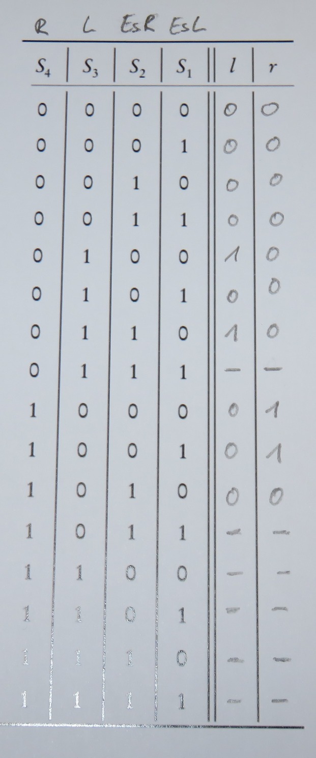 S4 . S3 S2 S1 l . r 0 0 . 0 0 0 . 0 0 0 0 1 0 0 0 0 1 0 0 0 0 0 1 1 0 0 0 1 0 0 1 0 0 1 0 1 1 0 0 1 1 0 1 0 0 1 1 1 x x 1 0 0 0 0 1 1 0 0 1 0 1 1 0 1 0 x x 1 0 1 1 x x 1 1 0 0 x x 1 1 0 1 .x . x 1 1 1 0 x . x 1 1 1 1 x x 1 0 1 0 x x Wieso soll der obige Fall dont care sein ? Verstehe ich nicht . Müsste er nicht nach rechts gehen und stehen bleiben ? Passt Tabelle jetzt?