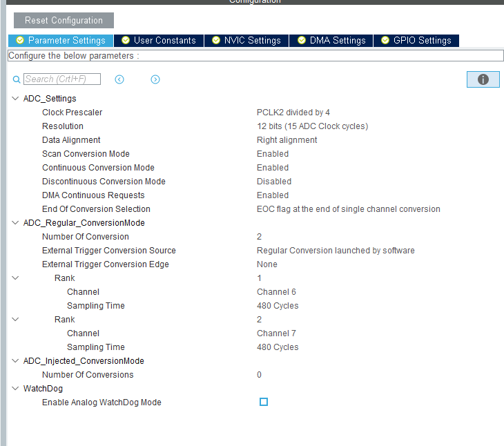 Hallo zusammen, ich verwende in dem STM32F411 ein ADC mit DMA Transfer (2 Kanäle). Alle Einstellungen konfiguriere ich in dem CubeMX. Das CPU (HCLK) lauft mit 96MHz Taktfrequenz. Der PCLK2 (an dem hängt ADC) wird mit gleiche Frequenz von 96MHz getaktet. Das ADC clock ist PCLK2/4 = 24MHz, ADC Auflösung 12 Bit, Sampling rate 480 Das Quellcode lauft wunderbar und ich kriege vom ADC gemessene Werte. Leider die berechnete Wandlungszeit stimmt nicht mit tatsächliche überein! Laut Datenblatt Wandlungszeit = 2*(12+480)*(1/24MHz) = 41us. (2 steht für zwei ADC Kanäle). Ich habe auch die tatsächliche ADC Wandlungszeit mit einem flackernden LED in DMA2_Stream0_IRQHandler gemessen. Zur meiner Überraschung lag der Wandlungszeit bei 82us !!! In dem CubeMX gibt es ein Check box "Use Fifo" (sehen Sie bitte angehängte Bildern). Ich habe den gesetzt gehabt. Mit Verdacht, dass daran die Ursache liegt, habe ich den gelöscht. Sobald ich den Check box lösche erhöht sich der Wandlungszeit auf 20,5us. Somit habe ich einmal das Doppelte Wandlungszeit von 82us, oder die Hälfte (20,6us), aber nie das berechnete ?! Was mache ich mit Berechnungen falsch ? Im voraus - Danke für eure Tipps!