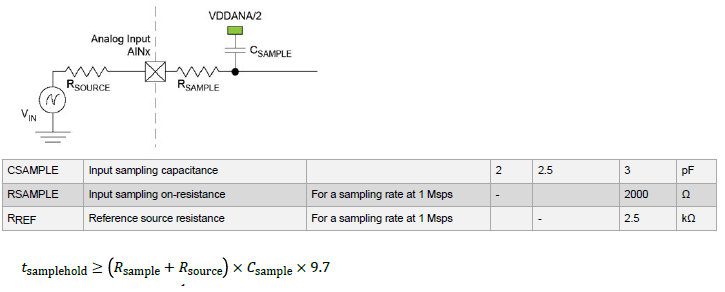 Hallo zusammen, ich möchte bei meinen µC einen ADC Pin mit der maximal möglichen Frequenz sampeln. Die Trackingzeit muss deshalb den minimalen Wert von 1 Clock Cycle betragen. Das steht auch so im DB. Wenn ich das ganze jetzt mit der Formel aus den DB nachrechne und meine Signalquelle als ideal annehmen beträgt Rsource = 0 OHM. Mit der Berechnung rechne ich dann aus, dass ich jedoch 1,4 Clock Cyckles Tracking Zeit brauche. (Rsample 0 2kOhm, Csample = 3 pF) Nur, wenn ich Rsource auf ca 1 kOhm erhöhe, kommt genau 1 Clock Cyckle heraus. Rein logisch gedacht würde doch der Rsource das Einpendeln der Eingangsspannung weiter verzögern anstatt zu beschleunigen. Kann mir jmd den physikalischen Grund erklären ?