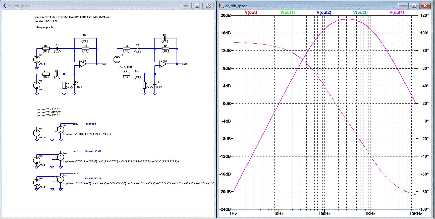 Ich habe mal mit Sapwin die Schaltung analysiert, dann von Hand gerechnet und zum Schluss mit LTspice simuliert. 1. Sapwin berechnet eine Formel die "stimmt", aber Sapwin kann Formeln nicht vereinfachen. Man muss erstmal erkennen ob gleiche Faktoren im Zähler und im Nenner da sind und dann man manuell eine Division machen. Da man ja im Normalfall nicht weiß, dass da gleiche Faktoren drinstecken ist das nicht befriedigend. 2. Nur wenn deine Bauteile in beiden Pfaden exakt gleich sind, ist es egal ob die Eingangsquelle zwischen den Eingängen hängt oder ob die Differenz von zwei geerdeten Quellen gebildet wird. T1=R1*C1 T2=R2*C2 T3=R2*C1 U1 +Eingang U2 -Eingang Ua = (U1-U2)*jw*T3/((1+jw*T1)*(1+jw*T2)) Im Anhang die Dateien zur Simulation mit LTspiceXVII.