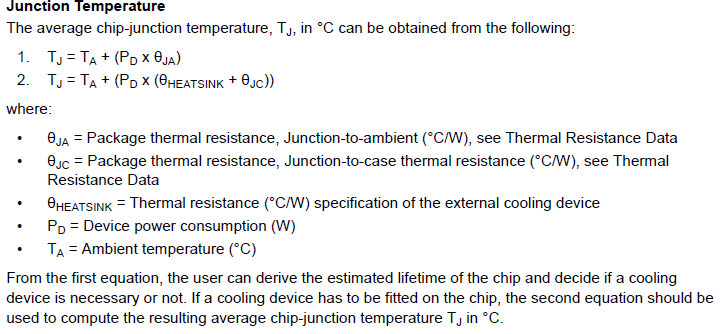 Hans schrieb: > Zur Leistung PD = Device power consumption (W) bin ich mir jetzt > unsicher, wie ich die bestimme. Diese Pd bestimmst Du im Wesentlichen über die Taktfrequenz des Bausteins. So wie soso schon richtig schreibt, geht bei hoher Taktfrequenz die Verlustleistung ordentlich hoch. Der Rest ist dann Einsetzen in die Formeln.