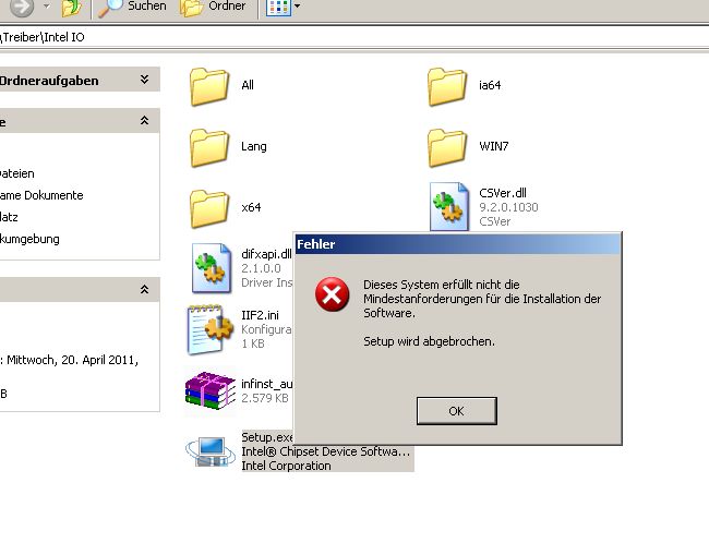 Naja, bei einem Laptop mit fester IDE-Schnittstelle wirds schwierig das Datenkabel zu tauschen. Da gibt es nämlich keins. Habe versucht den Intel XP Chipset zu installieren.Scheitert an angeblich Mindestanforderung. siehe Screenshot.