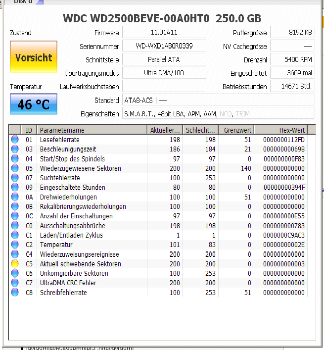 Laut CrystalDisc läuft die Platte unter :Ultra DMA/100 - WinXP Chipset hab neu draufgespielt. WD Diagnostic lahmt weiter. Unter XP mal 24 Std. mal 27 Std.