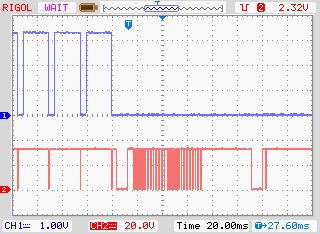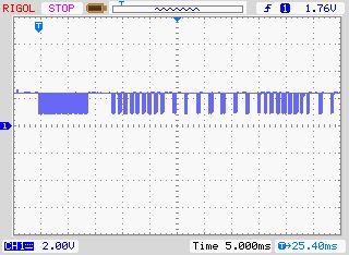 Bei der obigen Messung wird der Mittenanschluss ( vermutlich GND ) und der Ausgang des IR-Receivers beobachtet. Wenn ich den IR-Sender betätige, passiert das, was ich vermutet habe: Der Mittenanschluss geht für mindestens 200ms auf GND und am Ausgang kann man die Bits sehen. Damit scheint also folgendes zu funktionieren: Der IR-Sender sendet. Der IR-Empfänger in der Kerze merkt, dass gesendet wird und schaltet den IR-Receiver für mindestens 200ms ein. Die Bits sind am Ausgang sichtbar. Aber: Die Kerze leuchtet nicht! Hat noch irgend einer eine Idee, was ich jetzt noch testen könnte? Wo könnte der Fehler liegen? Hat der IR-Sender einen Schuss? Falsches Timing?