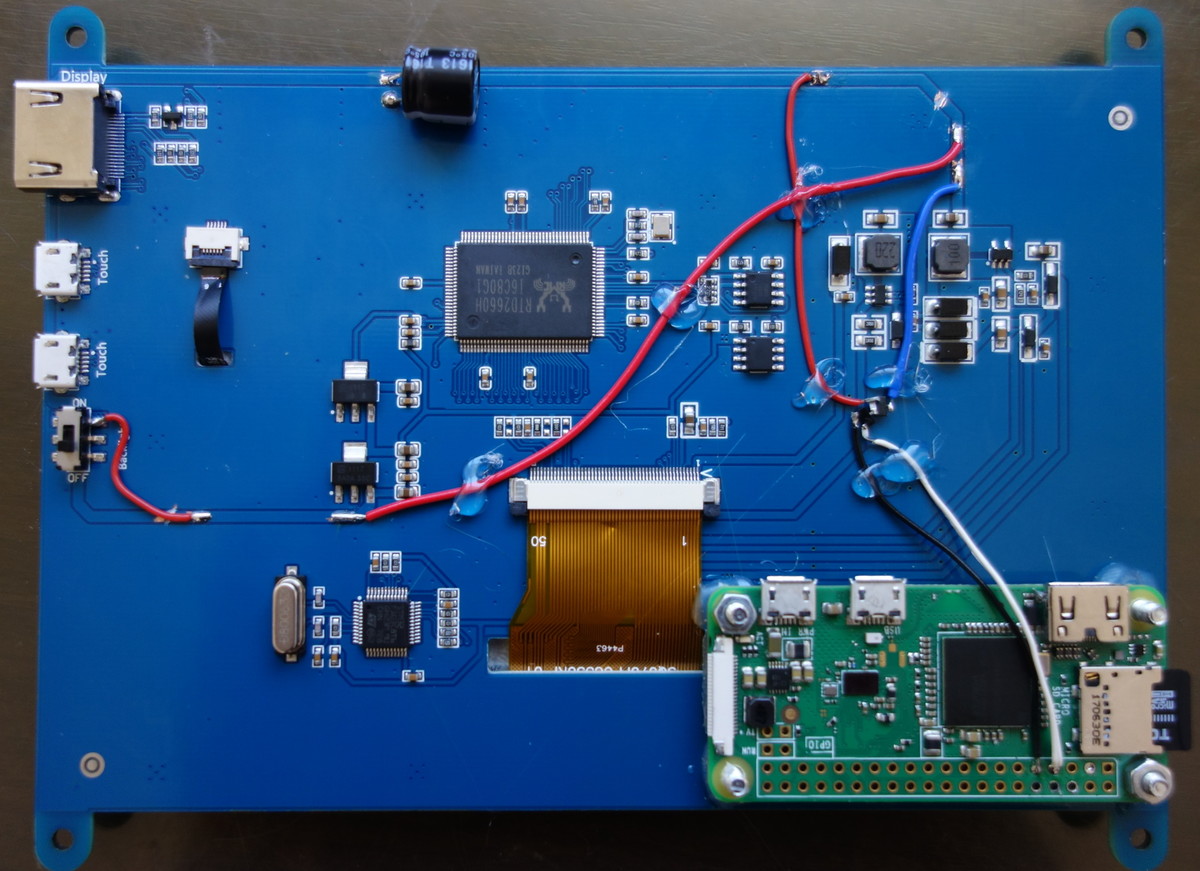 So sieht das jetzt unter heftiger Anwendung von Heißkleber aus. (Monitor von hinten) Die totale Abschaltung funktioniert mit p_MosFet via npn Transistor wunderbar. Der Info Schirm mit Raspi benötigt jetzt 0.09A wenn er nicht aktiv ist. Einziges Manko: Der Bildschirm braucht 5s bis er nach dem Einschalten wieder das Bild anzeigt. Jetzt warte ich noch auf den IR Sensor aus China.